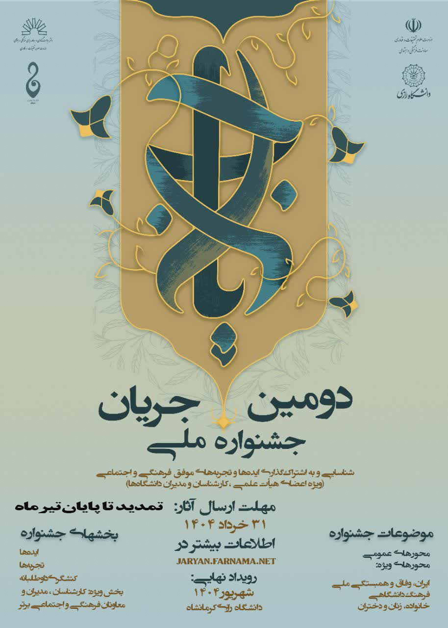 دفتر سیاست‌گذاری و برنامه‌ریزی فرهنگی و اجتماعی وزارت علوم، تحقیقات و فناوری به میزبانی دانشگاه رازی برگزار می‌کند: دومین جشنواره ملی جریان (شناسایی و به اشتراک‌گذاری ایده‌ها و تجربه‌های موفق فرهنگی و اجتماعی دانشگاه‌ها).