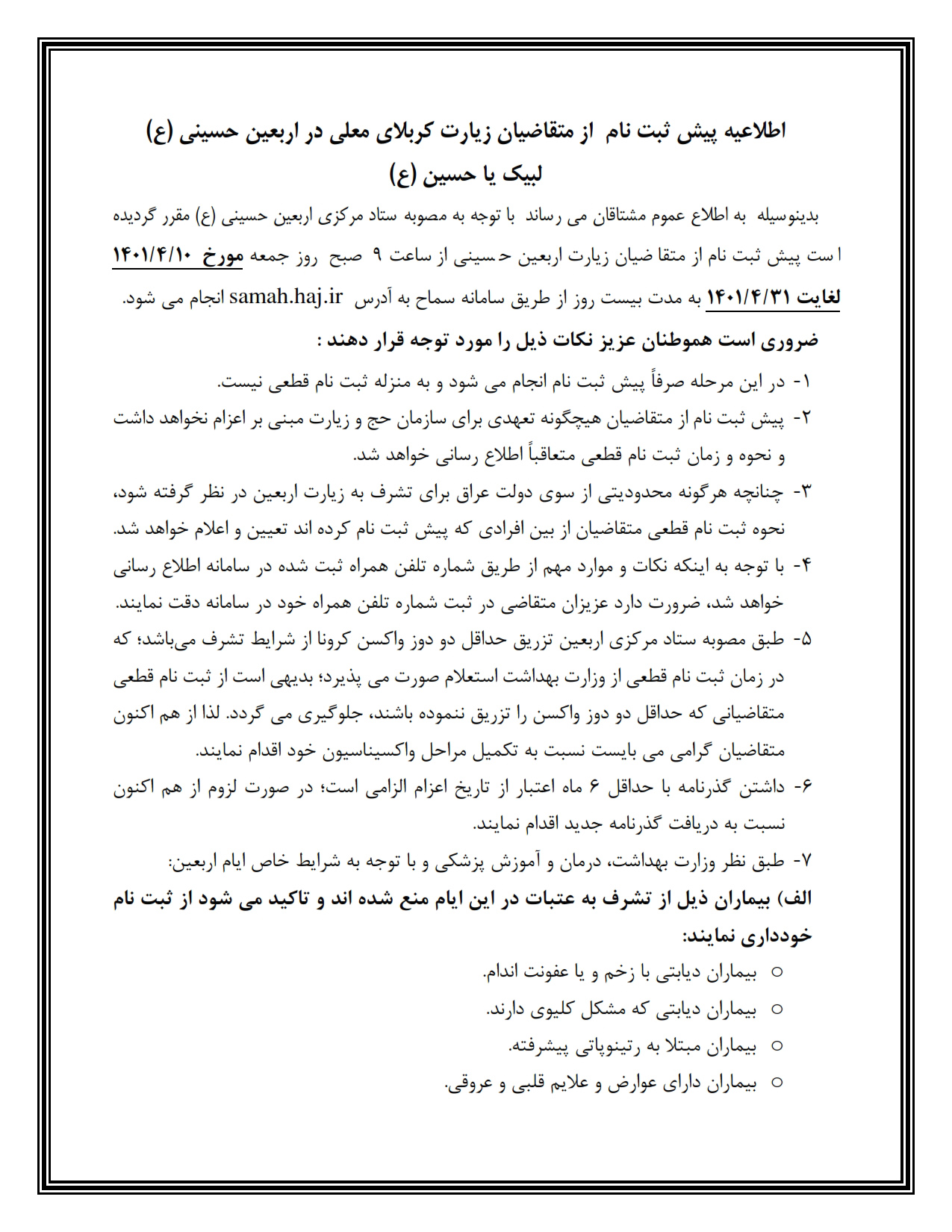 پیش ثبت نام متقاضیان زیارت کربلای معلی در اربعین حسینی (ع)