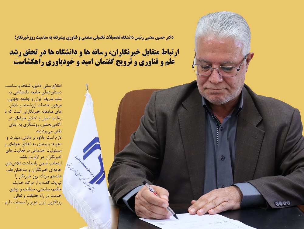 اطلاعرسانی دقیق، شفاف و مناسب دستاوردهای جامعه دانشگاهی به ملت شریف ایران و جامعه جهانی، مرهون خدمات ارزشمند و تلاشهای صادقانه خبرنگارانی است که با رعایت اصول و اخلاق حرفهای در آگاهیبخشی، روشنگری به ایفای نقش میپردازند.